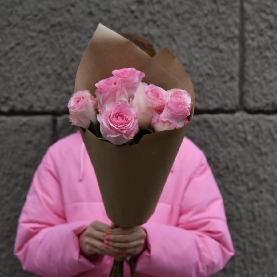 На фото букет из 7 розовых роз. В составе: роза 7 шт, дизайнерская упаковка 1 шт, атласная лента 1 шт, . Все цветы свежие и ароматные, букет красиво оформлен и отлично подходит для подарка. Доступна доставка цветов или самовывоз.
