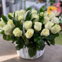 Композиция 31 белой розы в белой корзине в Кимовске