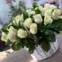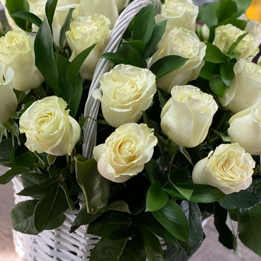 На фото композиция 31 белой розы в белой корзине. В составе: роза 31 шт, корзина (m) 1 шт, . Все цветы свежие и ароматные, букет красиво оформлен и отлично подходит для подарка. Доступна доставка цветов или самовывоз.