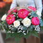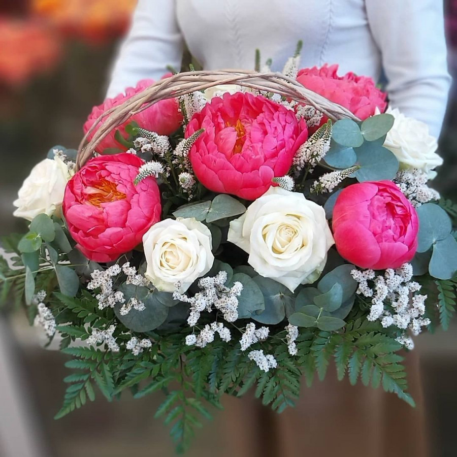 На фото коралловые пионы в корзине. В составе: пион 5 шт, роза 5 шт, статица 7 шт, папоротник 3 шт, эвкалипт 3 шт, корзина (m) 1 шт, . Все цветы свежие и ароматные, букет красиво оформлен и отлично подходит для подарка. Доступна доставка цветов или самовывоз.