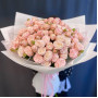 На фото пионовидные розы бомбастик. В составе: кустовая пионовидная роза 25 шт, крафт-бумага 1 шт, . Все цветы свежие и ароматные, букет красиво оформлен и отлично подходит для подарка. Доступна доставка цветов или самовывоз.